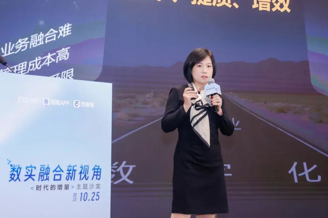 10月25日,中兴通讯与百度APP、百家号联合举办的“时代的增量”主题沙龙第二期在北京召开,主题为“数实融合新视角”。数位来自业界的专家、学者齐聚于此,围绕产业数字化转型、数实融合新模式进行思想碰撞,共同助力中国数字经济建设。中兴通讯副总裁、品牌及公关总经理陈志萍以《双轮驱动数实融合,共促产业高质量发展》为主题进行演讲。