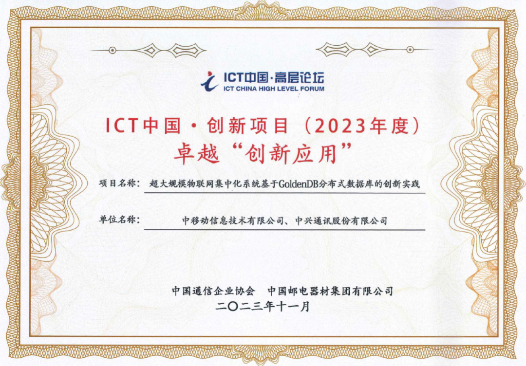2023年11月30日,“第四届数字化转型推动高质量发展大会”在海口顺利举办,大会召开“ICT应用创新发展论坛”,并发布由中国通信企业协会负责的“ICT中国(2023)案例”。本次评选共征集800余个有效案例,中移动信息技术有限公司(以下简称“中移信息”)与中兴通讯联合申报的“超大规模物联网集中化系统基于GoldenDB分布式数据库的创新实践”从中脱颖而出,荣获卓越一等案例!