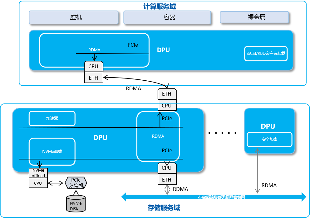 RDMA offload:DPU通过RDMA网络直接访问远端存储,低时延,低抖动,低CPU使用率;