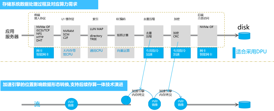 对存储系统数据处理全路径中对应的算力需求进行完整分析,可发现DPU上存储加速主要应用包含以下几个方面。