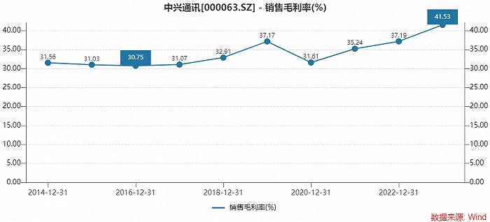 中兴通讯自2000年销售毛利率跌破40%以来,去年是其首次再度站上40%关口,取得了41.53%的销售毛利率表现,同比提高了4.34个百分点。