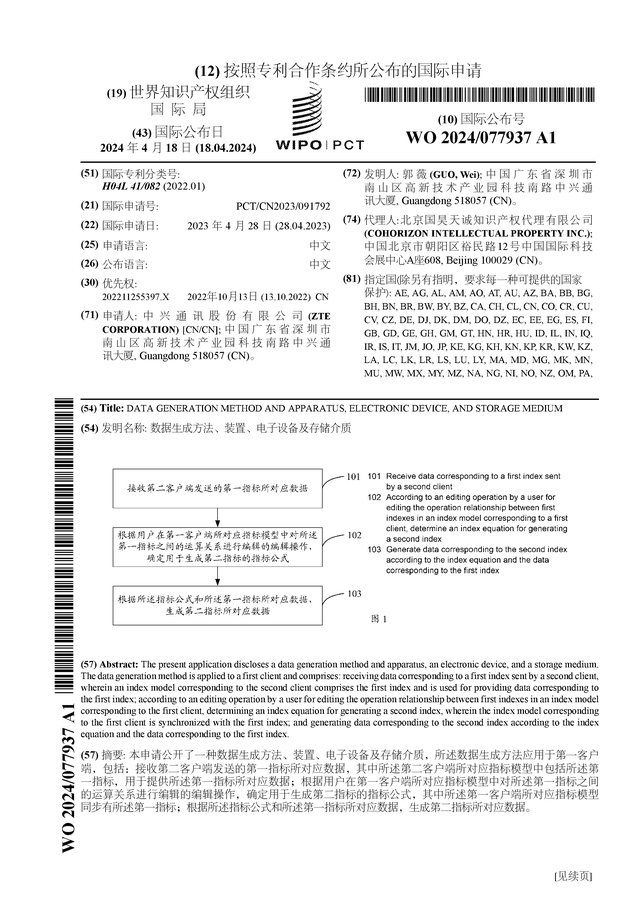 数据显示中兴通讯(000063)公布了一项国际专利申请,专利名为“数据生成方法、装置、电子设备及存储介质”,专利申请号为PCT/CN2023/091792,国际公布日为2024年4月18日。
