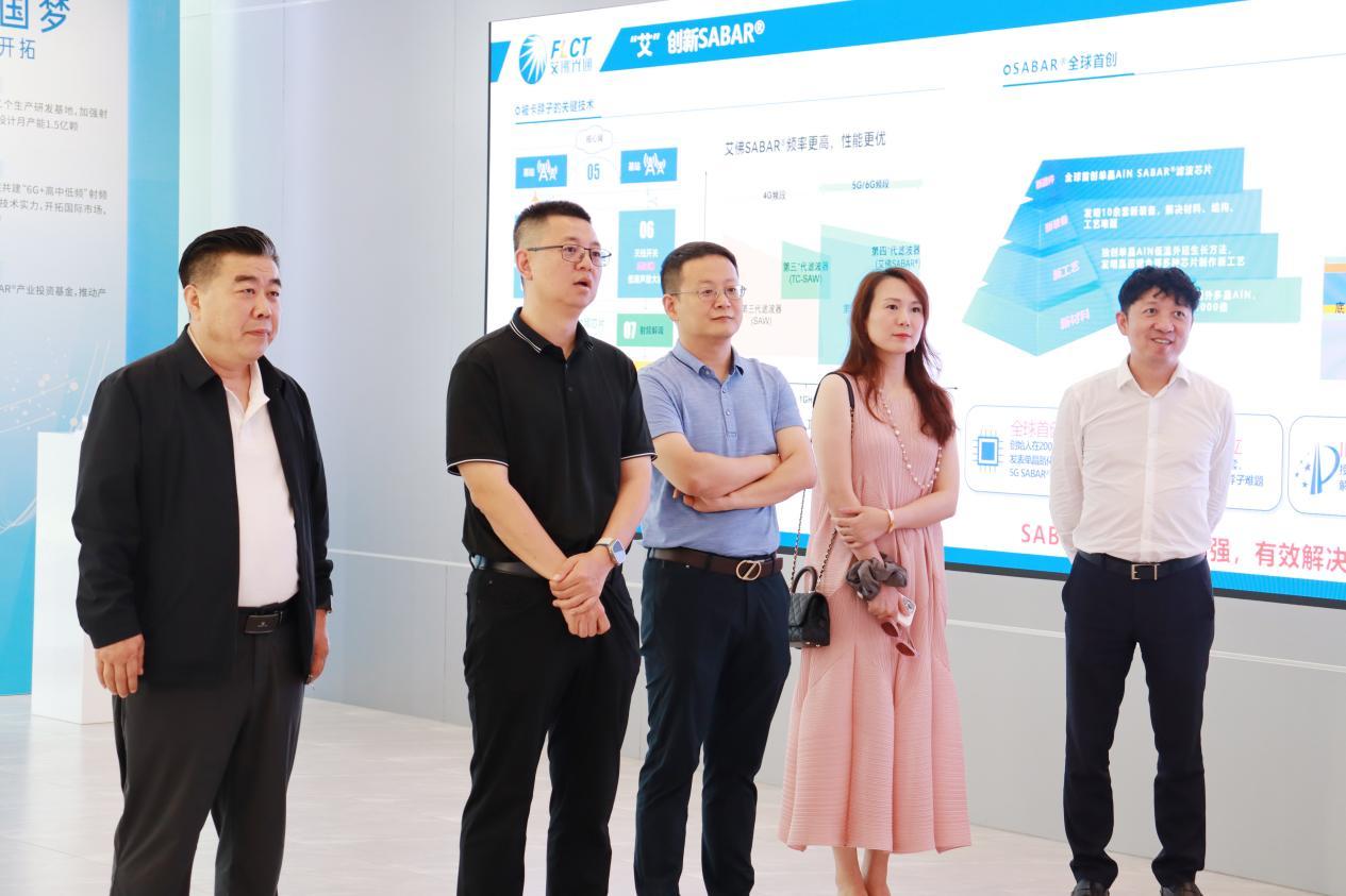 在董事长贺董和李总等一行的陪同下,张总一行参观了公司科技展厅及产线。李总详细介绍了公司的发展历程、SABAR?滤波芯片独创技术、产品创新点、市场客户以及未来发展战略,张总一行重点了解公司首创独立自主的滤波芯片技术路线、研发及产业化进程情况,并对艾佛光通在射频滤波芯片领域率先打破国外技术垄断,为我国通信终端企业提供独立自主的国产高端体声波滤波芯片表示高度认可。