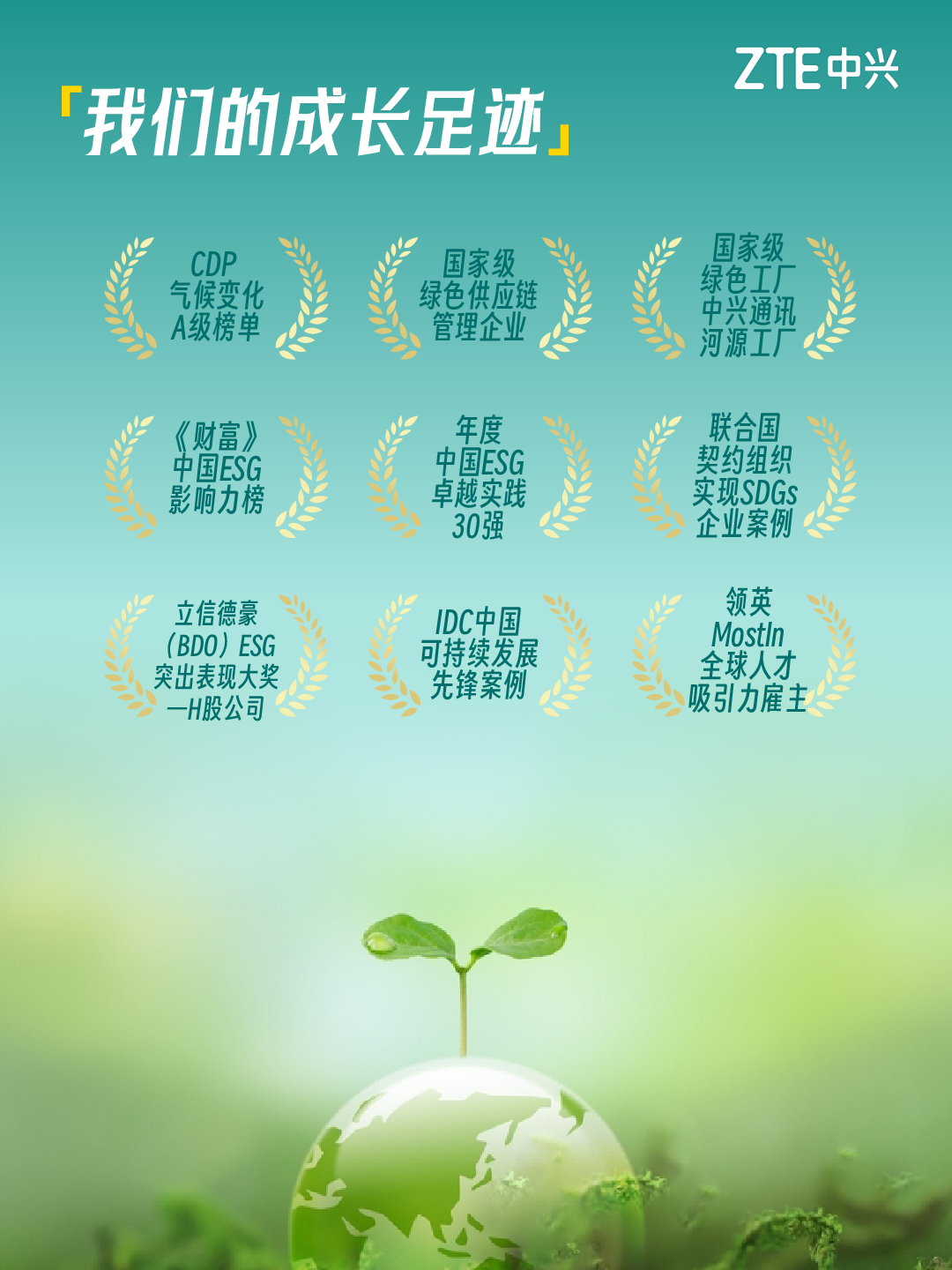 作为联合国全球契约组织(UNGC)和全球电子可持续发展倡议组织(GeSI)的成员,中兴通讯凭借在可持续发展和ESG方面的卓越贡献获多方认可。2023年中兴通讯成功入选联合国契约组织实现可持续发展目标企业案例,第八次入选富时社会责任指数系列(FTSE4Good Index Series);公司连续三年入选《财富》中国ESG影响力榜,荣获“年度中国ESG卓越实践30强”和“IDC中国可持续发展先锋案例”等荣誉资质。