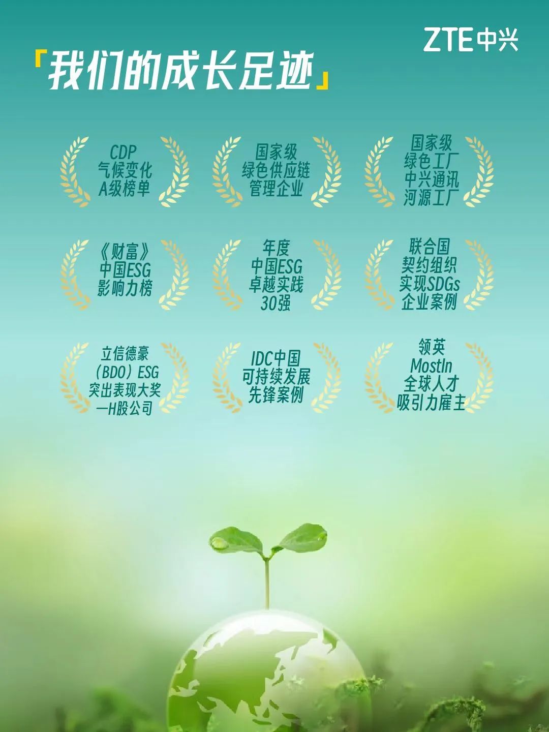 过去几年间,中兴通讯的CDP评级表现也逐步提升,从2021年的“B”级提升到2022年的“A-”级,到2023年成为全球346家气候变化最高评级"A"级的公司之一。在CDP这一具有高认可度的全球运营环境信息披露平台中,这意味着最高的环境信息公开透明度。