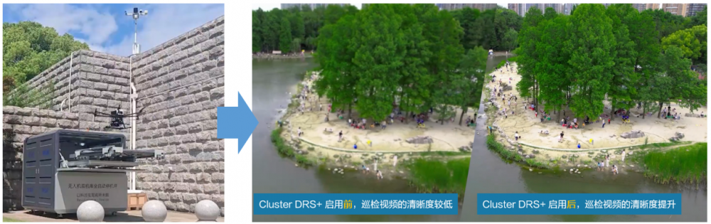 Cluster DRS+方案基于5G商用网络,进行波束的方向灵活调整实现地面和低空的一体覆盖,提升网络资源利用率;叠加虚拟双频专网技术,即基于同一个物理频段配置两个逻辑小区,使得低空无人机和普通用户的业务相互无影响;同时以无人机为中心实现多小区的深度协作,保障无人机的上行大带宽业务体验无波动。通过在世纪公园商用Cluster DRS+方案的效果对比来看:在Cluster DRS+实施前,由于低空信号干扰强,50Mbps的速率保障率仅能达到67%,4K高清视频容易出现卡顿和马赛克等情况。Cluster DRS+功能商用,50Mbps的速率保障可达97%以上,25Mbps的保障可达99.4%以上,无人机的实时视频回传清晰流畅,大幅提升了数据传输质量和无人机巡检效率。