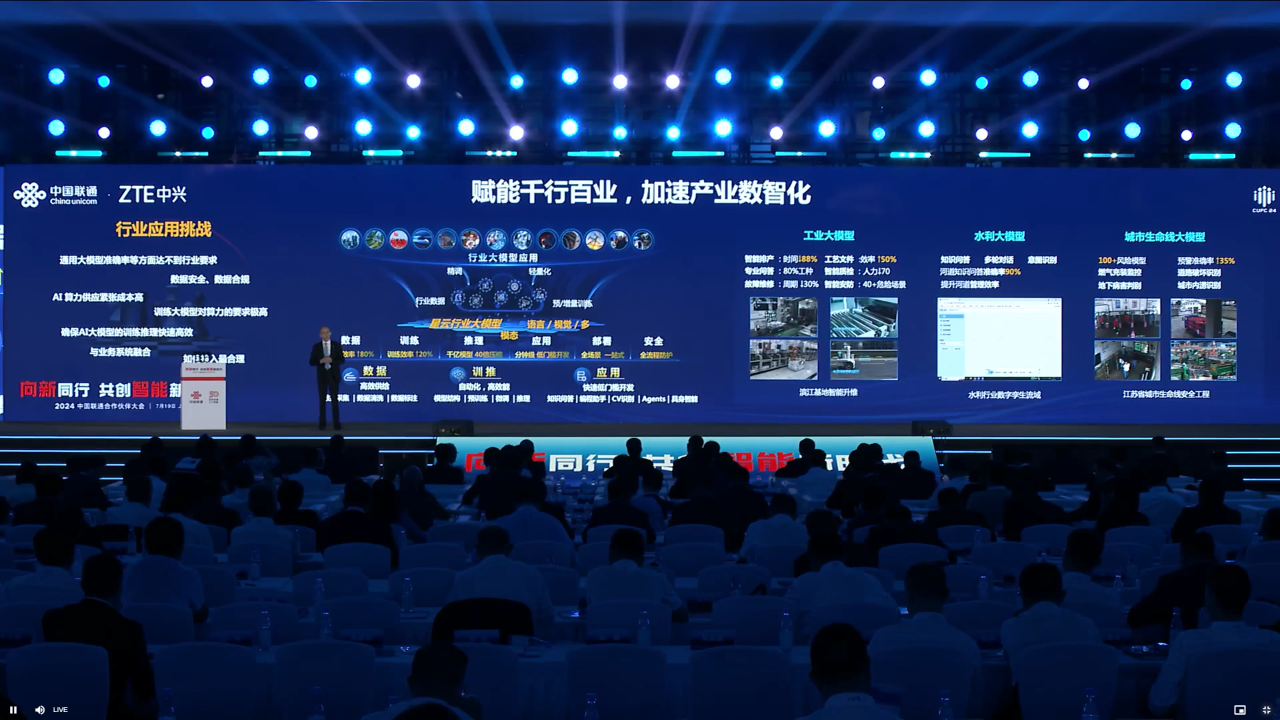 7月19日,以“向新同行,共创智能新时代”为主题的2024中国联通合作伙伴大会在上海举行,中兴通讯总裁徐子阳受邀出席大会主题峰会并发表《AI兴业,智领未来—中兴通讯的智能创新之路》的主题演讲,与业界嘉宾深入探讨AI技术赋能产业转型升级中的挑战与实践。