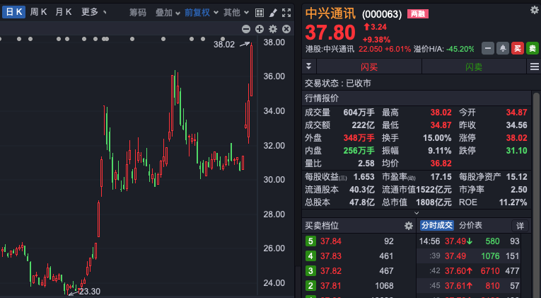 中兴通讯本轮大涨始于12月17日,当日该股大幅高开,盘中一度涨停,当天成交量达到167.3亿元,一举拿下当日A股成交额的冠军。次日,该股继续上涨4.22%,12月19日,中兴通讯股价大涨9.38%,成交额222亿元,再次创下历史新高。