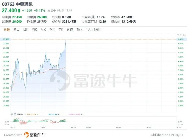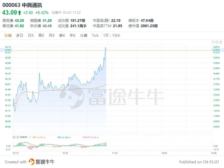 中兴通讯AH股齐涨,中兴通讯(00763.HK)拉升涨超6%,报27.4港元,成交额8.65亿港元;中兴通讯(000063.SZ)涨6.42%,报43.09元。