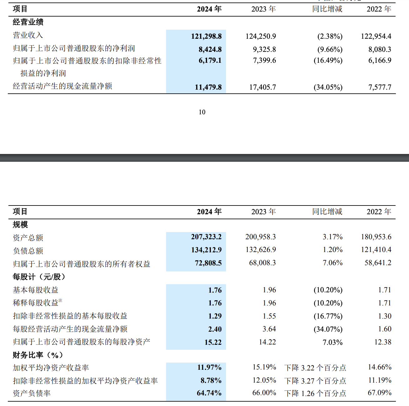 净利润:归属于上市公司普通股股东的净利润84.25亿元,同比减少9.66%。扣除非经常性损益后的净利润更是下滑了16.49%。