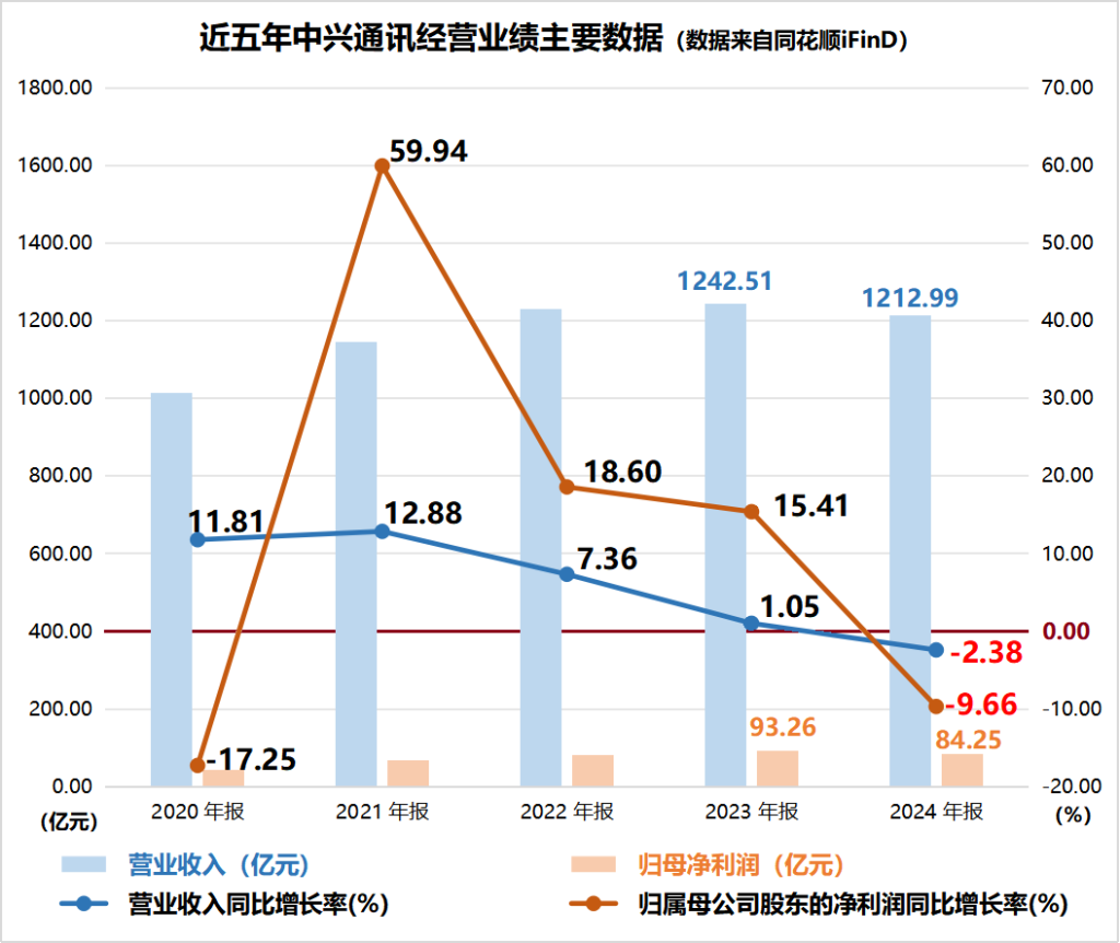 早在2019年至2023年期间,正值5G规模化发展与产业渗透阶段,中兴通讯运营商网络业务就已经呈现出营收增速普遍放缓的态势。直至2024年,5G市场进入价值深耕阶段,中兴通讯这一业务的业绩开始下坡。