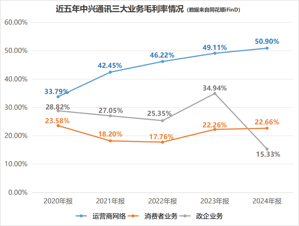 中兴通讯的“第二曲线”主要包括政企业务和消费业务。虽然2024年这两大业务的营收同比都有上升,但盈利能力十分“不给力”。受服务器及存储毛利率下降和收入结构变动的影响,政企业务的毛利率同比大幅下降19.61%,而消费业务的毛利率还不及运营商网络业务毛利率的一半,尚显“瘦弱”的盈利能力没能兜住运营商网络业务缩水带来的损失。