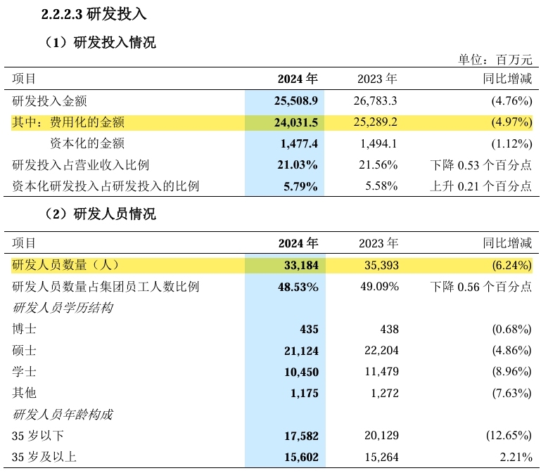 技术突围需要研发投入支持。2024年,公司的研发人员锐减2209人;研发费用同比减少4.97%,约为240.3亿元。研发投入缩减,叠加技术转化效率存疑,难免会削弱市场对中兴通讯的信心与信任。