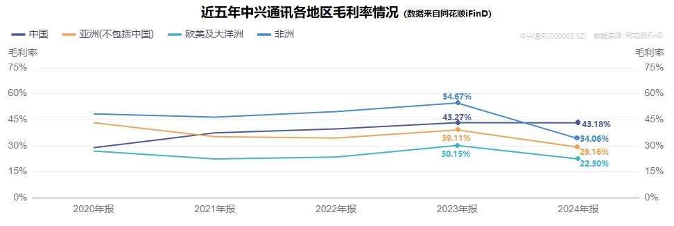 在服务器领域,受地缘、成本等因素的冲击,中兴通讯同样面临市场竞争加剧的局面,导致利润空间受限。这一点,中兴通讯2024年国际市场的业绩已经有所体现。2024年,公司国际市场的营收虽然同比增长,但毛利率普遍下降。尤其是在近几年通信头部企业争相发力的非洲地区,毛利率同比大幅下降20.61%,可见中兴通讯的市场竞争力不算乐观。