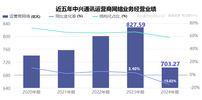 中兴通讯业绩差强人意,与占比最大的运营商网络业务“失速”有关。2024年,公司运营商网络业务的营业收入同比下降15.02%。