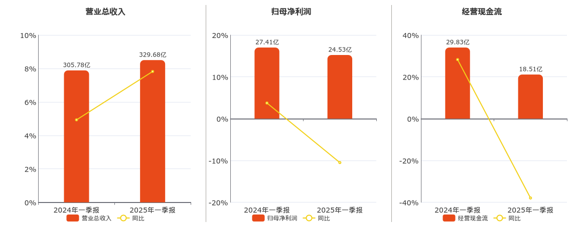 公司营业总收入为329.68亿元。归母净利润为24.53亿元,较去年同报告期归母净利润减少2.88亿元,同比较去年同期下降10.50%。经营活动现金净流入为18.51亿元,较去年同报告期经营活动现金净流入减少11.31亿元,同比较去年同期下降37.93%。