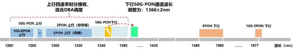 1、窄频EPON、非窄频EPON、对称和非对称10G-EPON、对称和非对称50G-PON共六类ONU终端在同一个ODN中上线,通过上行方向混合DBA调度机制实现所有ONU终端带宽分配和正常工作。