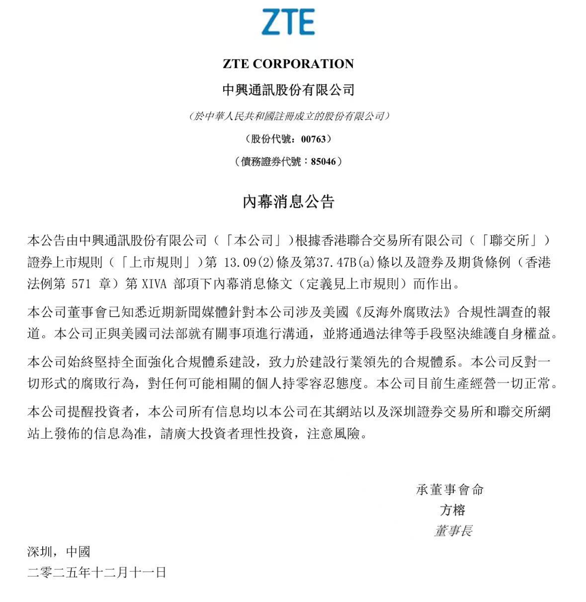 12月11日, 中兴通讯 (00763.HK)公告,公司已知悉近期新闻媒体针对本公司涉及美国《反海外 腐败 法》合规性调查的报道。本公司正与美国司法部就有关事项进行沟通,并将通过法律等手段坚决维护自身权益。本公司始终坚持全面强化合规体系建设,致力于建设行业领先的合规体系。本公司反对一切形式的 腐败 行为,对任何可能相关的个人持零容忍态度。本公司目前生产经营一切正常。