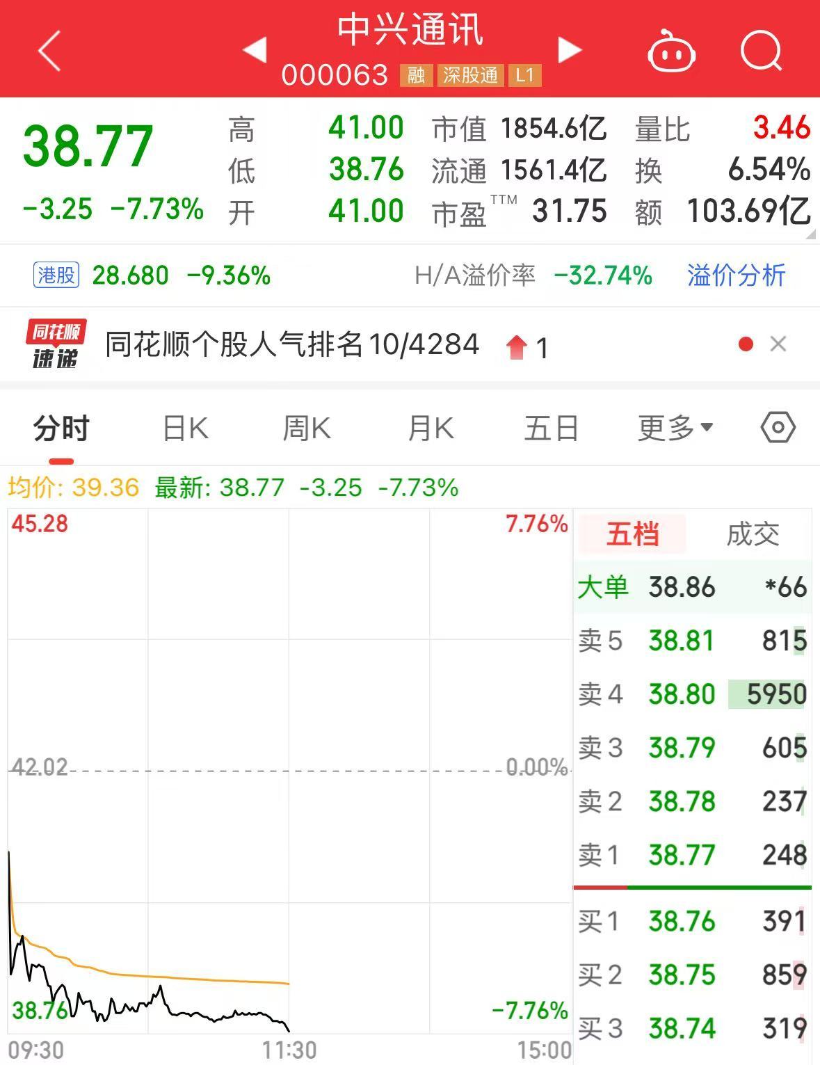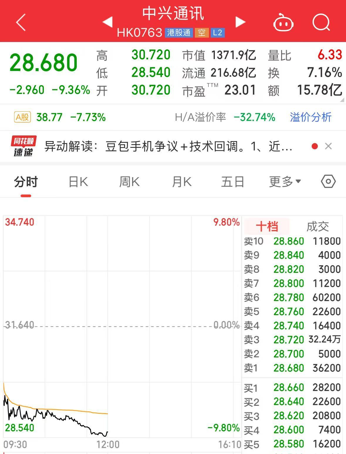 盘面上, 中兴通讯 今日A股、港股双双大跌。截至A股午间收盘, 中兴通讯 股价跌7.73%;截至港股午间收盘, 中兴通讯 股价跌9.36%。