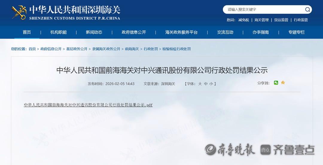 近日,中华人民共和国前海海关发布对中兴通讯股份有限公司行政处罚结果公示。