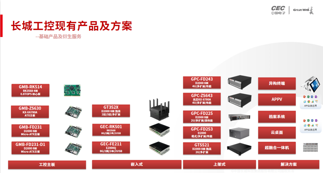 中国长城积极布局交通、能源等重点行业,携手各类创新主体,加大关键核心技术攻关,充分发挥中国长城在自主安全软硬件体系的优势,构建关键行业基础设施底座。近年来,中国长城加速自主研发一系列国产化工控产品,包括工控主板、嵌入式工控机、上架式工控机及云桌面、APPV等综合性解决方案,以中国科技力量推动工业自动化智能转型,为新型工业化建设,实现经济高质量发展贡献长城力量。