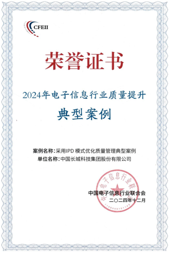 近日,由中国电子信息行业联合会主办的2024电子信息行业发展大会在盐城召开。会上发布了“2024年电子信息行业质量提升典型案例”,中国长城的“采用IPD模式优化质量管理案例”入选2024年电子信息行业质量提升典型案例。