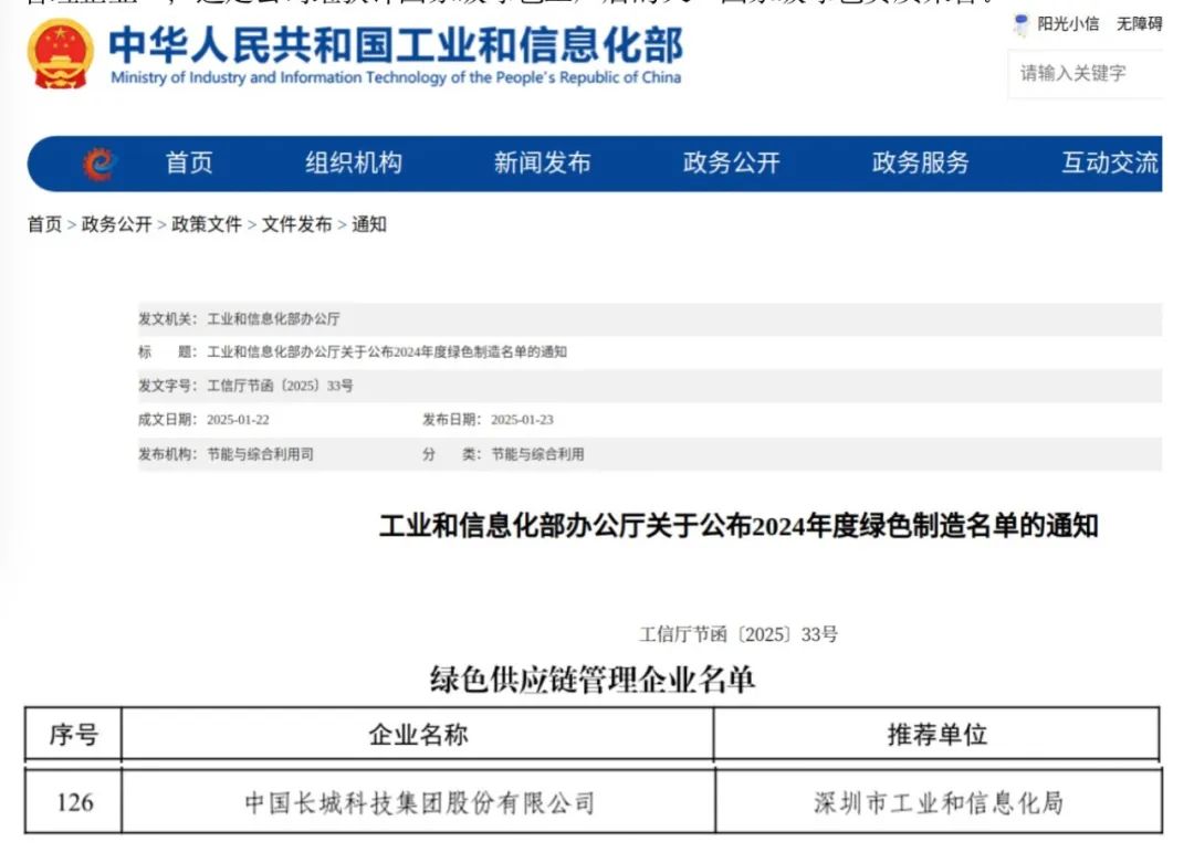 近日,国家工信部公布了2024年度绿色制造名单,中国长城荣获“国家级绿色供应链管理企业”,这是公司继获评国家级绿色工厂后的又一国家级绿色资质荣誉。