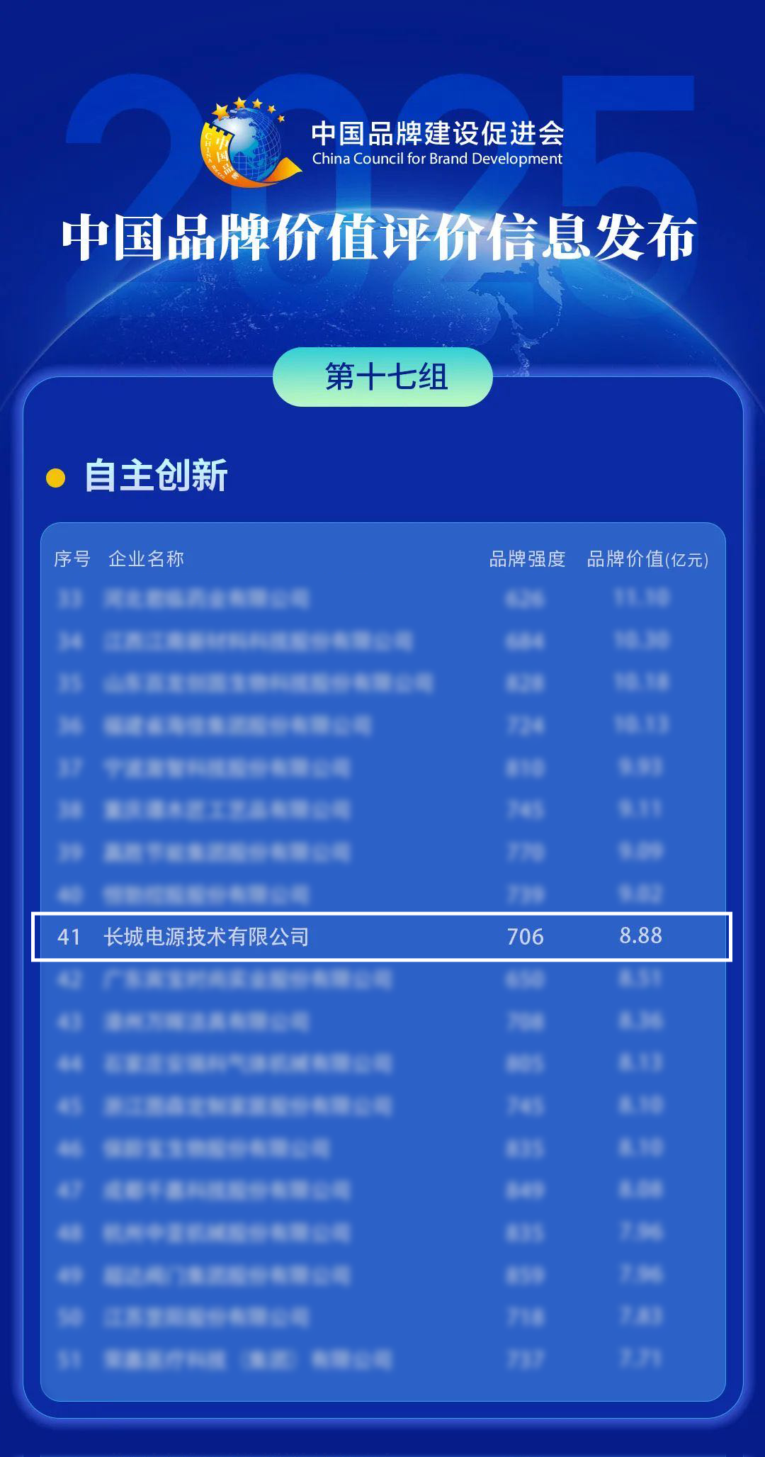 长城电源以品牌强度706、品牌价值8.88亿元,位列自主创新品牌第41位。