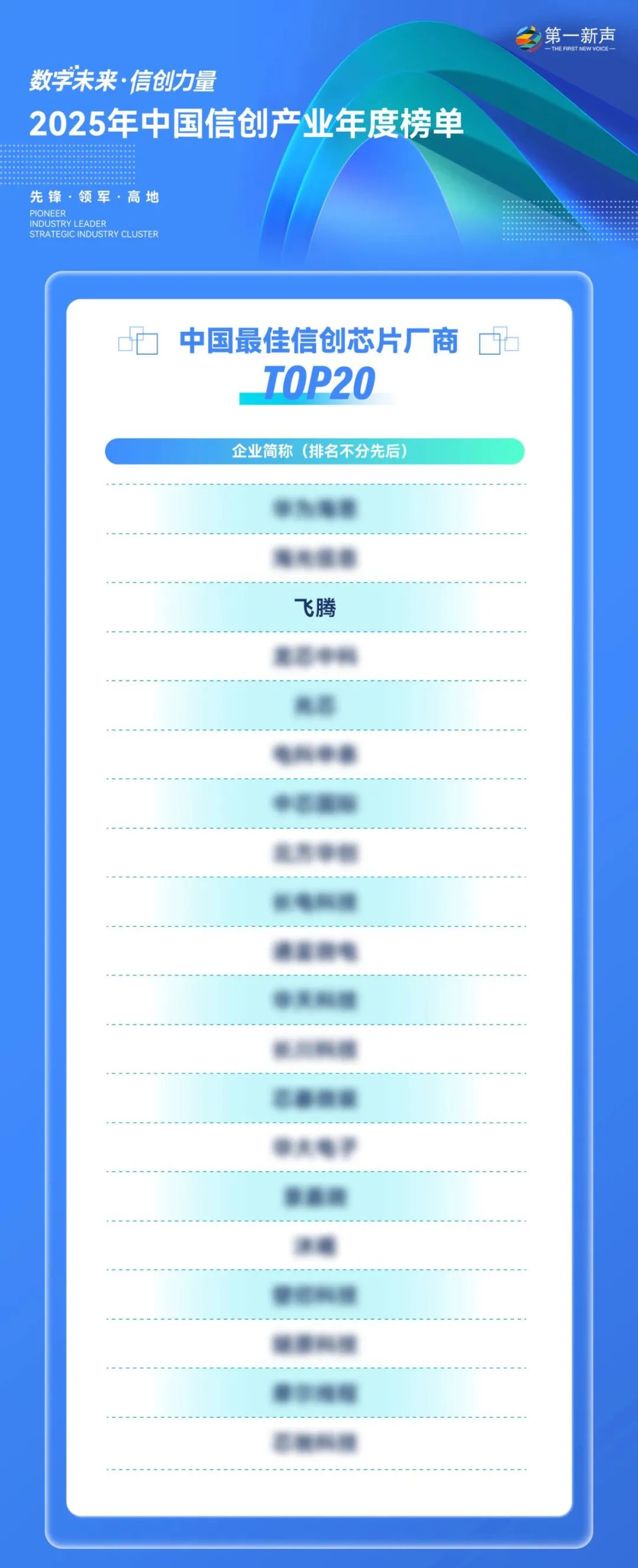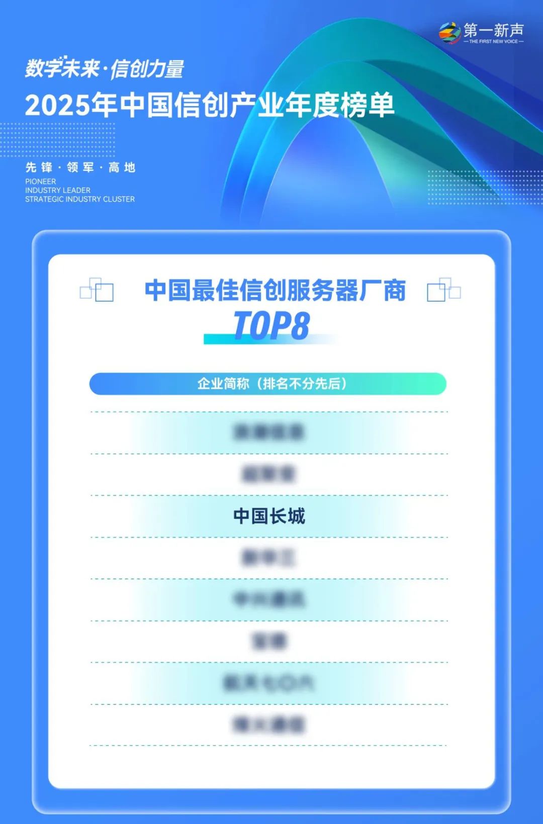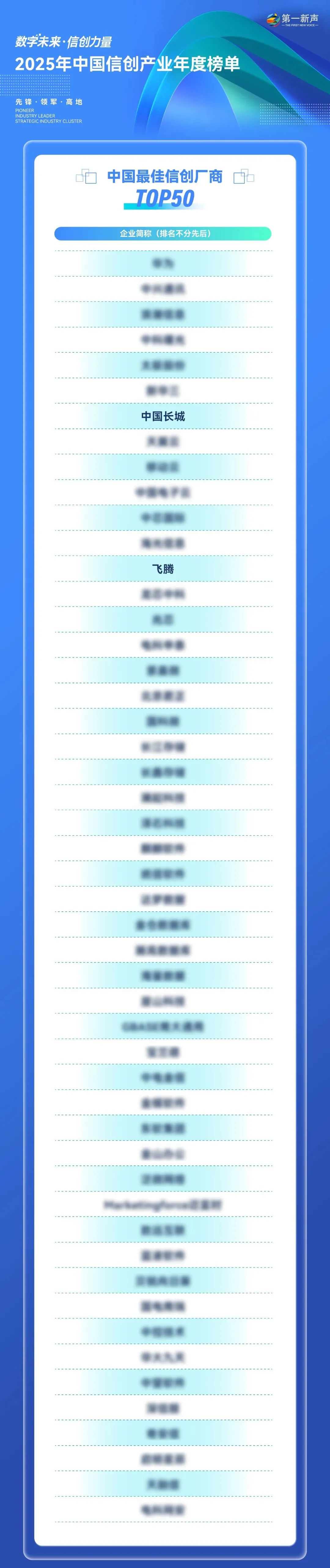 近日,国内科技产业信息服务平台第一新声发布了2025年中国信创产业年度榜单。中国长城凭借在信创领域的自主研发能力、创新性的产品方案,以及在信创市场的优异表现,入选“2025年中国最佳信创厂商TOP50”“2025年中国最佳信创服务器厂商TOP8”,战略参股企业飞腾公司入选“2025年中国最佳信创厂商TOP50”“2025年中国最佳信创芯片厂商TOP20”。