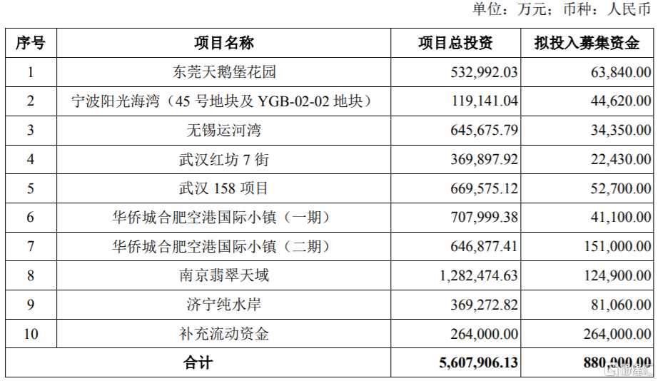 本次发行的募集资金在扣除发行费用后的净额将全部用于东莞天鹅堡花园、宁波阳光海湾(45号地块及YGB-02-02地块)、无锡运河湾、武汉红坊7街、武汉158项目、华侨城合肥空港国际小镇(一期)、华侨城合肥空港国际小镇(二期)、南京翡翠天域、济宁纯水岸及补充流动资金等。