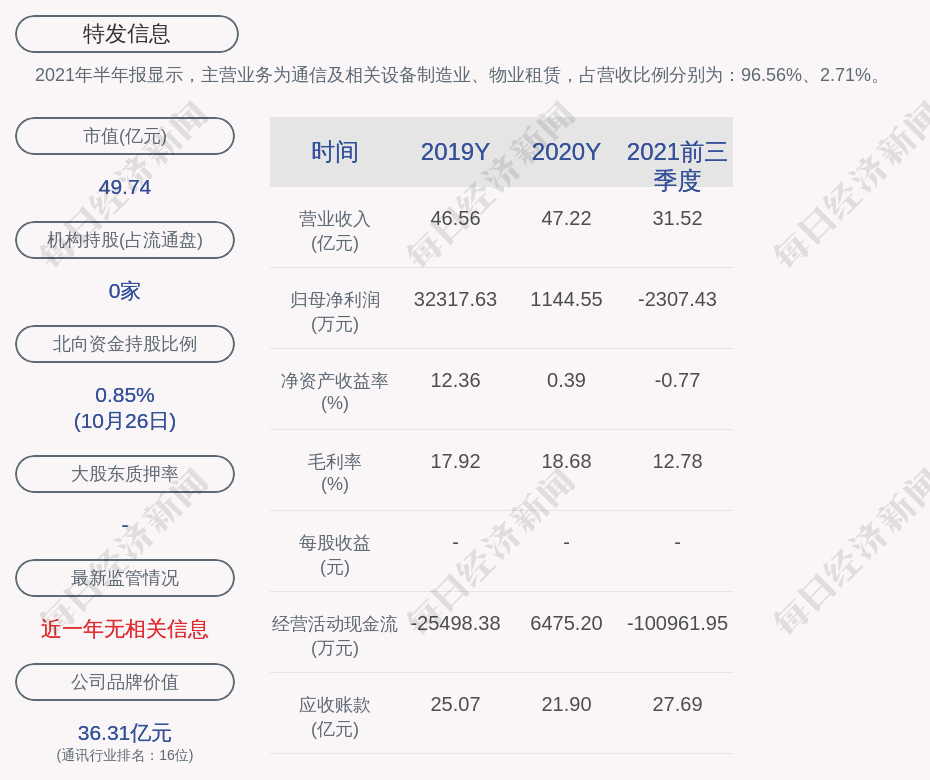 2021年半年报显示,特发信息的主营业务为通信及相关设备制造业、物业租赁,占营收比例分别为:96.56%、2.71%。