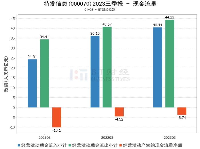 再次,从现金流量方面来看,特发信息2023年三季度的经营活动现金流入小计为40.44亿元,较上年同期的36.15亿元有所增长。经营活动现金流出小计为44.23亿元,较上年同期的40.67亿元有所增加。这表明公司的经营活动现金流入有所增加,但现金流出也在增加,现金流压力较大。
