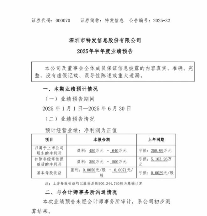 7月15日,深圳国资系上市公司特发信息(000070.SZ)发布2025年半年度业绩预告,预计2025年1月1日至2025年6月30日归属于上市公司股东的净利润为450万元至640万元,上年同期为亏损258.99万元;扣除非经常性损益后的净利润为350万元至500万元,上年同期为亏损5103.26万元。