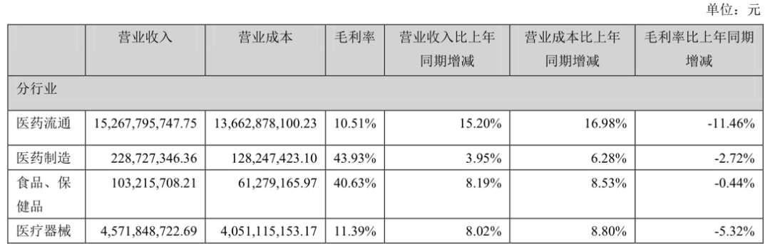 其中,医药流通板块实现营业收入152.68亿元,医疗器械业务实现营业收入约45.72亿元;在医药制造板块方面,该公司上半年实现营业收入约2.29亿元,此外,食品、保健品板块实现营业收入为1.03亿元。