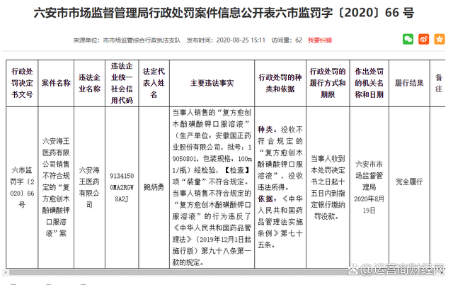2020年8月,六安市市场监督管理局网站公示的《行政处罚案件信息公开表》(六市监罚字〔2020〕66号)显示,上市企业海王生物的旗下公司六安海王医药有限公司销售不符合规定的“复方愈创木酚磺酸钾口服溶液”。