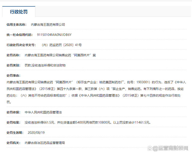 无独有偶,同一时间,内蒙古自治区药品监督管理局网站公示的行政处罚信息((内)药监药罚〔2020〕41号)显示,内蒙古海王医药有限公司经营的药品检验不符合规定,该公司也属于海王生物旗下药企。