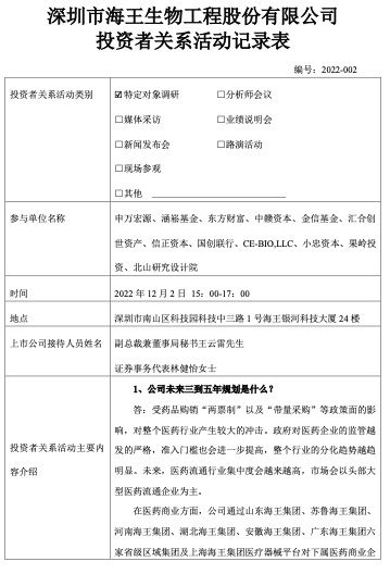 有投资者询及,公司如果混合所有制改革成功后未来想象力有多大?海王生物答复:若公司混合所有制改革成功,公司将结合国企的资源、资金优势与民企的高效、灵活、渠道等优势,坚持产业链布局、着重打造医疗器械板块、加大布局医药工业、突破新业务的战略路径,以新产品引进和构建综合医疗器械平台为突破,实现公司产业链、价值链由低层次向高层次的逆袭,帮助公司持续做大做强。