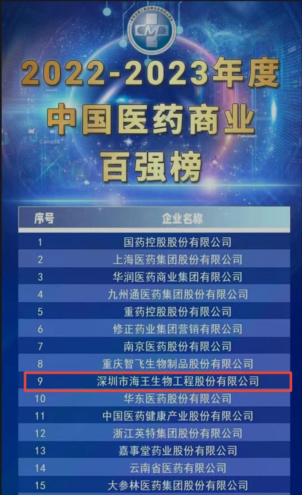 近日,全国工商联医药业商会发布“2022-2023年度中国医药商业百强榜”。海王生物(000078.SZ)榜上有名,位列第九,连续三年上榜中国医药商业百强前十。