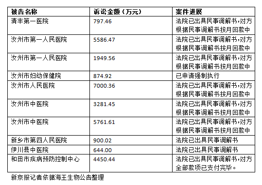 在海王生物及控股子公司作为原告或申请人涉及的诉讼案件中,有10起案件涉及8家医疗机构及疾控中心,分别为清丰第一医院、汝州市第一人民医院、汝州市妇幼保健院、汝州市中医院、汝州市人民医院、新乡市第四人民医院、伊川县中医院、和田市疾病预防控制中心,涉案金额累计超3.12亿元。