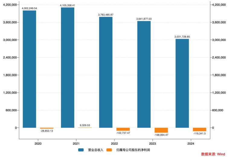 回溯历史业绩, 海王生物 的经营压力早已显现。2020年至2024年期间,除2021年外,公司营收持续下滑,净利润连续四年处于亏损状态,最近三年累计亏损金额约39亿元,分别为10.17亿元、16.9亿元和11.93亿元。