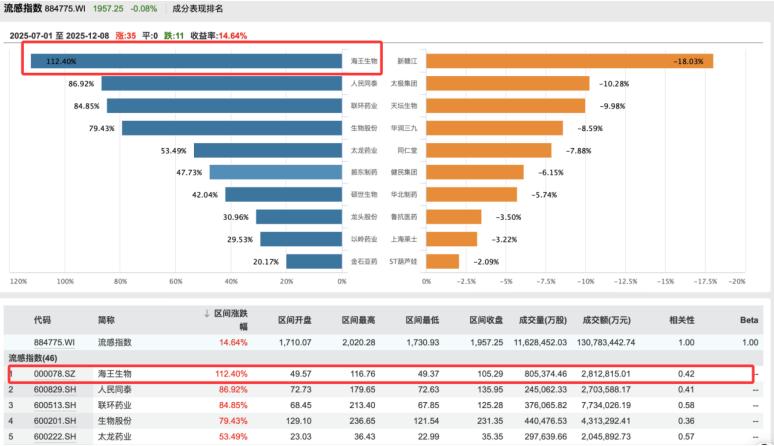 Wind 数据显示,截至12月8日,下半年以来流感概念指数(884775.WI)累计上涨14.64%,在各类概念板块中位居前列,板块内35只个股实现上涨。其中, 海王生物 (000078.SZ)的表现尤为抢眼,在11月26日至12月5日的8个交易日内斩获7个涨停板,股价创下五年多来新高,同期累计涨幅超100%,也因此接连发布股票交易异常波动公告。公司在最新公告中提示,其市净率显著高于行业平均水平,存在市场情绪过热、非理性炒作风险,并明确提醒投资者注意股价快速下跌的可能。