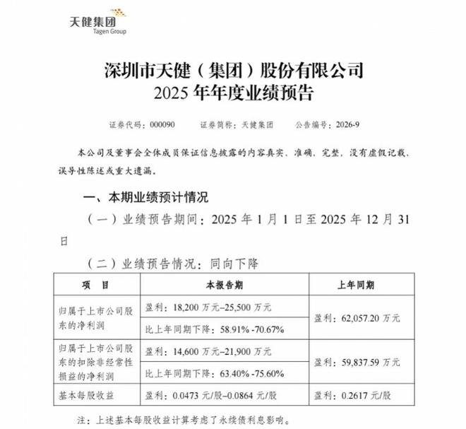 1月31日,深圳国资控股上市公司天健集团(000090.SZ)披露2025年年度业绩预告,公司业绩再度遭遇大幅下滑。公告显示,天健集团2025年预计实现归母净利润1.82亿元至2.55亿元,较上年同期的6.21亿元同比下降58.91%至70.67%;扣除非经常性损益后的归母净利润为1.46亿元至2.19亿元,同比降幅进一步扩大至63.40%至75.60%,业绩表现创下近年新低。