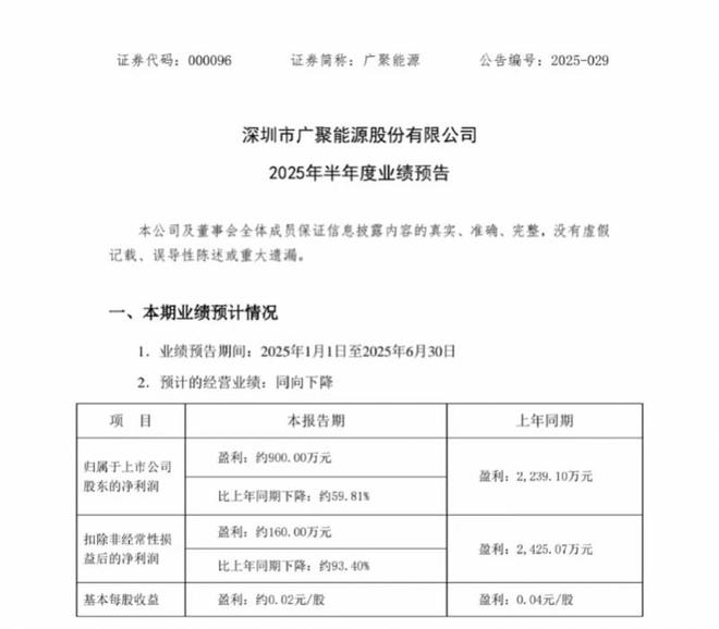 7月12日,深圳市南山区国有资产监督管理局实控的广聚能源(000096.SZ)发布业绩预告,2025年上半年净利润仅900万元,较上年同期大幅下滑59.81%;公司扣除非经常性损益后的净利润仅为160万元,同比暴跌93.40%。