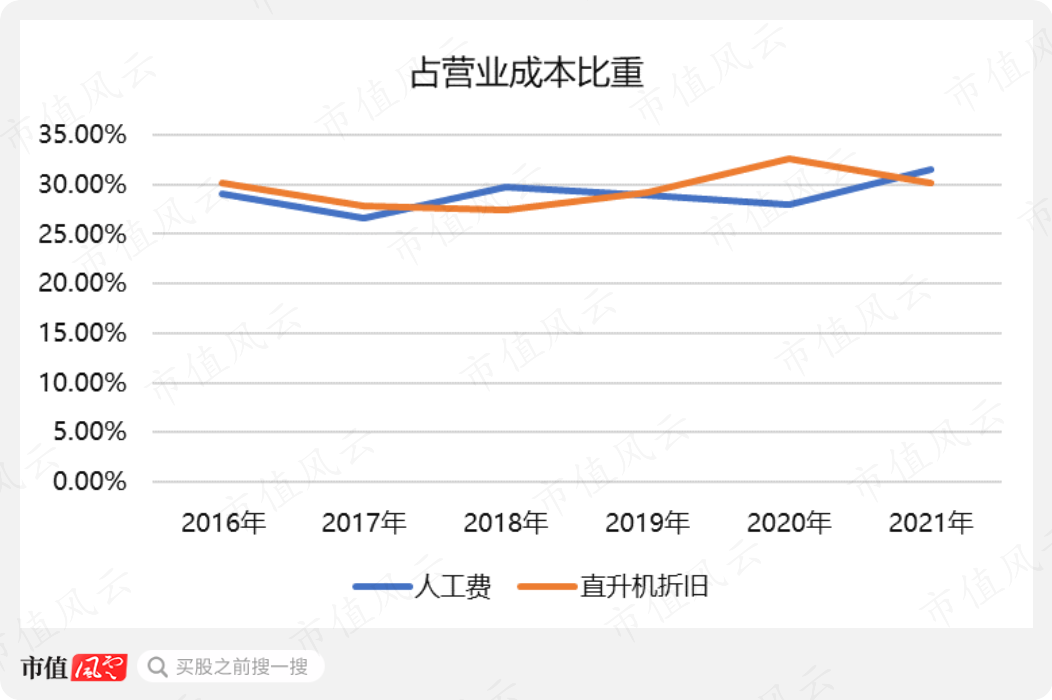 也因此,飞行员工资和直升机折旧费是各年成本支出中的大头,近些年占营业成本的比重均在30%左右。