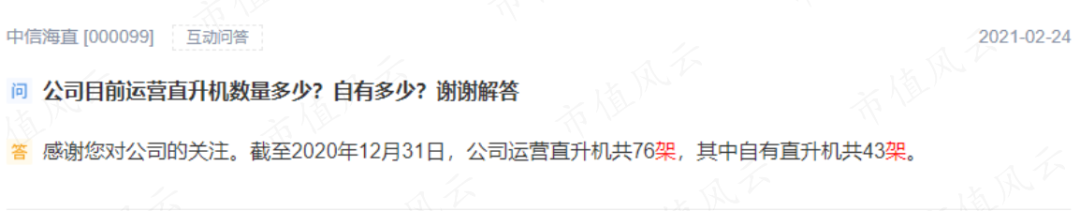 按照中信海直2021年2月在互动易披露的43架自有直升机数量,结合公司后来披露的购置规划,风云君推算中信海直目前自有直升机约50架左右。