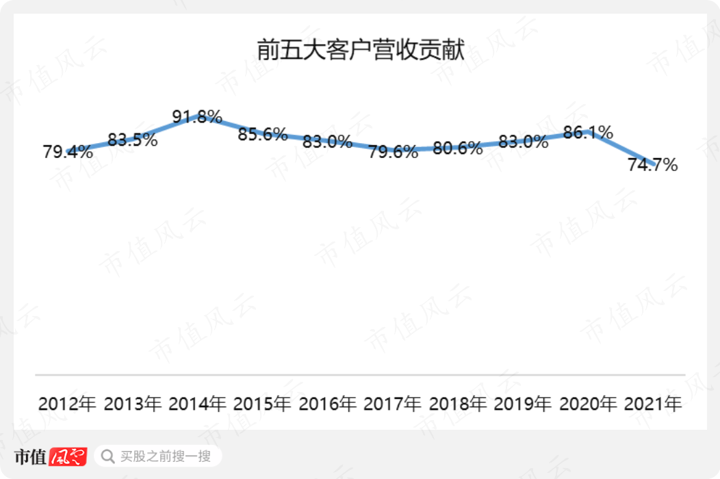 此外,这些海上直升机飞行服务之外的其他飞行服务,缺点也很明显:也同样都是大客户。近十年来,前五大客户的营收贡献基本都超80%。
