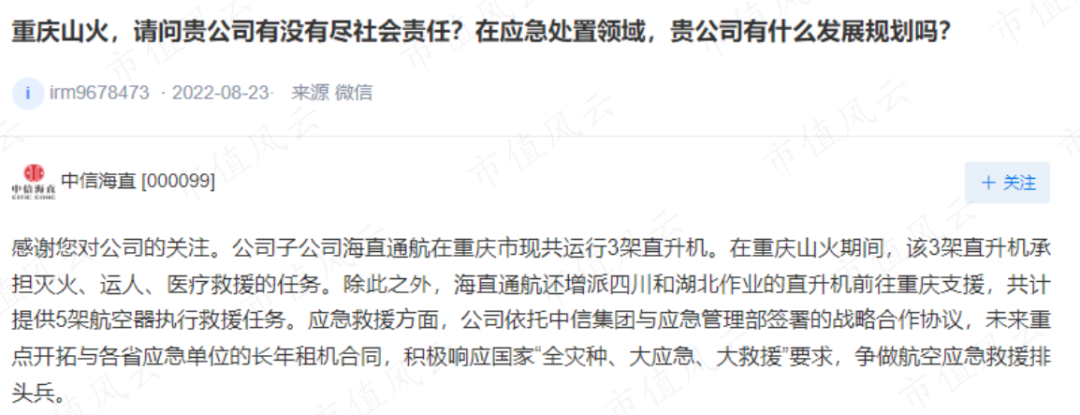 今年8月份的重庆山火中,中信海直也积极参与救援。