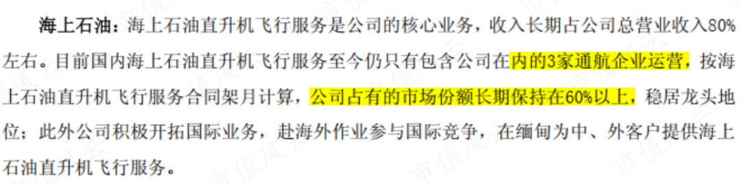 2016年之前,中信海直是国内仅有的三家提供海上石油直升机飞行服务的通航企业之一,且市场份额长期保持在60%之上,牢牢占据第一的位置。