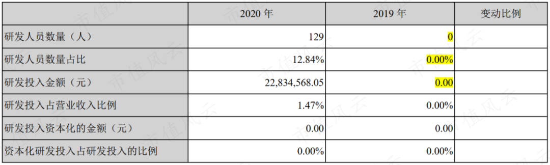 一开始,风云君一度以为这是会计分类导致的,但公司2020年年报确实白纸黑字的写着2019年研发人数为0,研发投入为0。