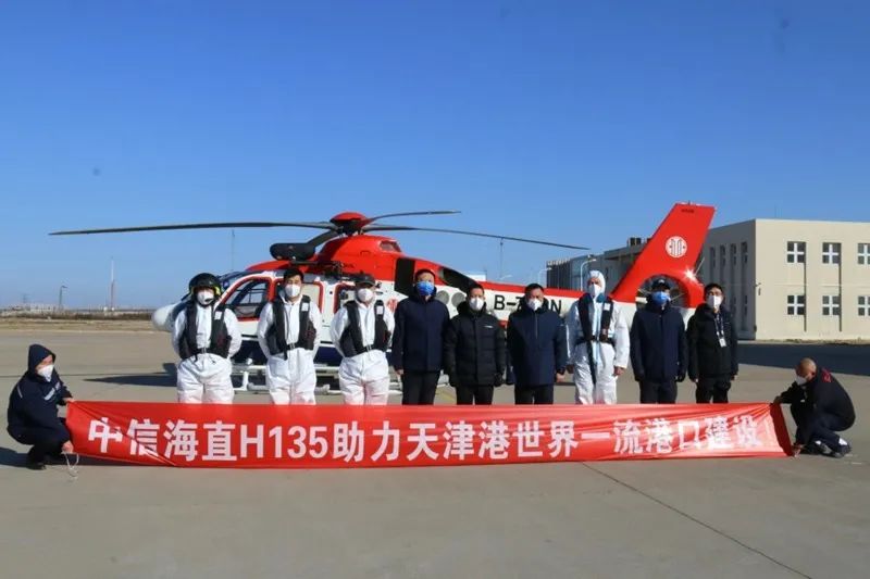 2022年12月27日,中信海直正式启用H135型直升机执行天津港引航员的接送项目,在天津塘沽机场圆满完成了引航首飞。天津港引航中心主任冯志东、中信海直天津分公司总经理陈子丰及各部门代表现场见证了首飞。